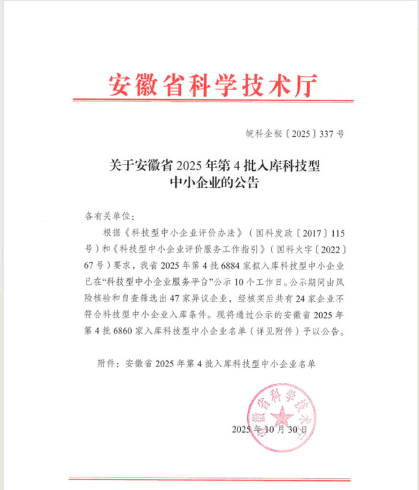 发布人:科迪达化工 发布时间:2025-11-06 浏览次数:854近日,安徽省科学技术厅发布2025年第四批入库科技型中小企业名单,安徽科迪达化工有限公司凭借在科技创新方面的扎实积累,成功入选。